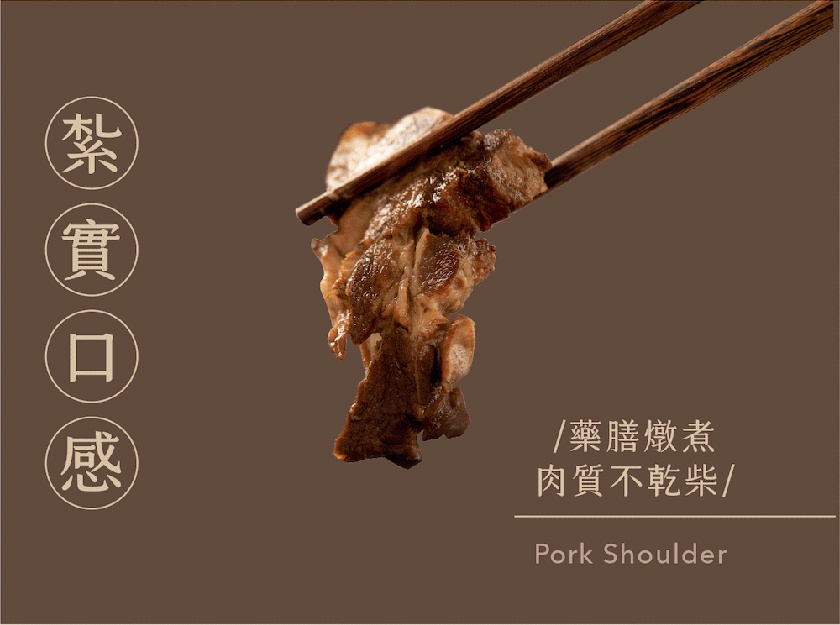 胛心肉附著在骨頭上,融合藥膳香氣,肉質軟嫩不乾柴!選用多達14種中藥材熬煮,每一鍋藥膳湯再出爐時必須熬煮5個小時,湯底的甜味大多來自於選用甘甜的藥材還有台灣豬肉本身的甜份呈現出來。