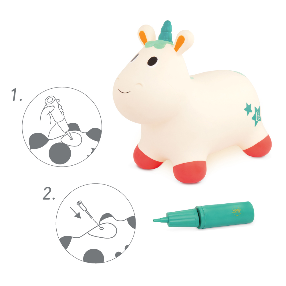 月曆紙捲成魔法帽,浴巾披成巫師袍,揮揮食指,點到的東西都變成糖果!翹翹左腳、抬抬右腳,抓緊耳朵,一二三,往前跳過彩虹橋。獨角獸變瘦了,就用幫浦打打氣,恢復精神繼續魔法冒險吧~