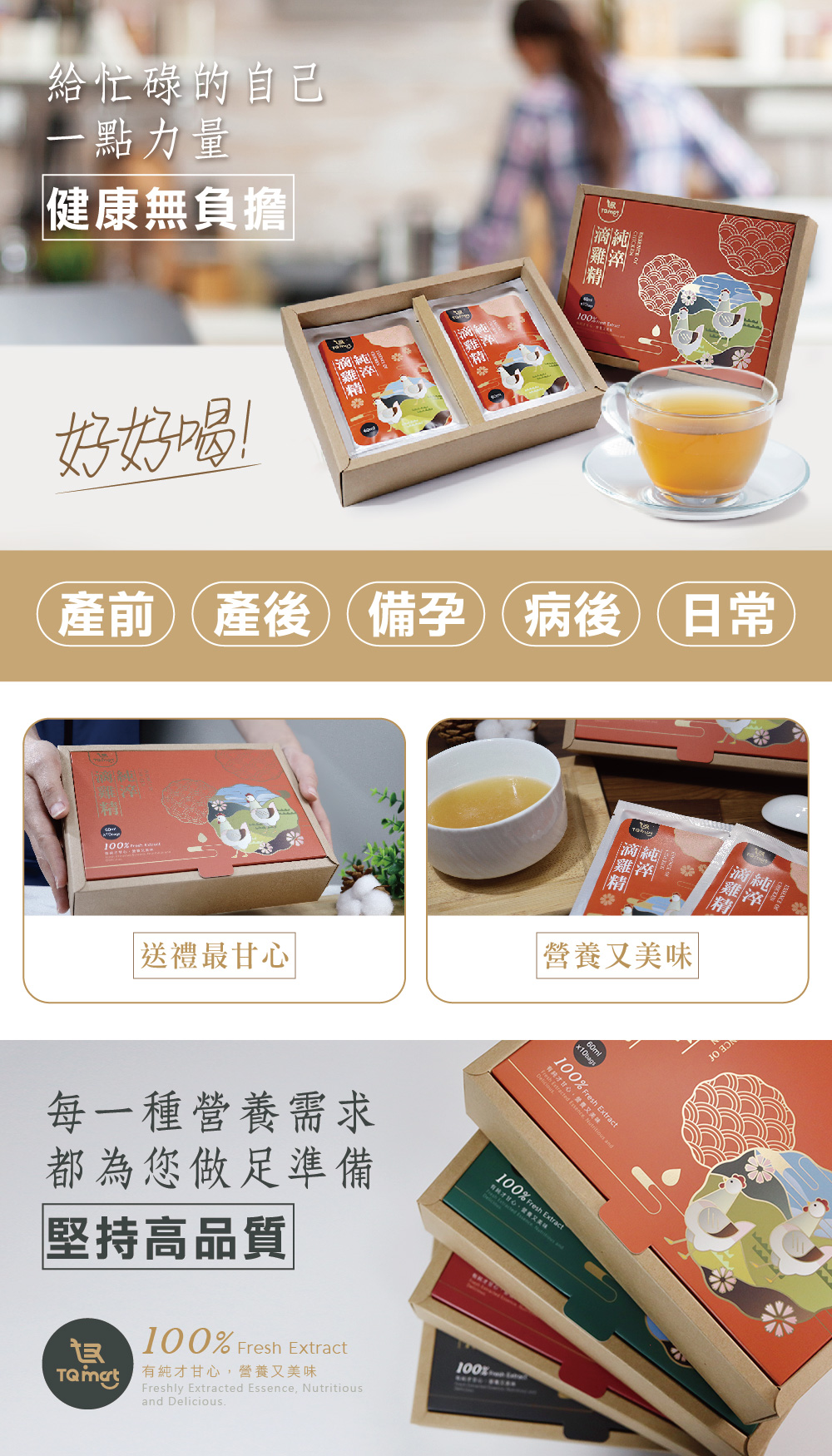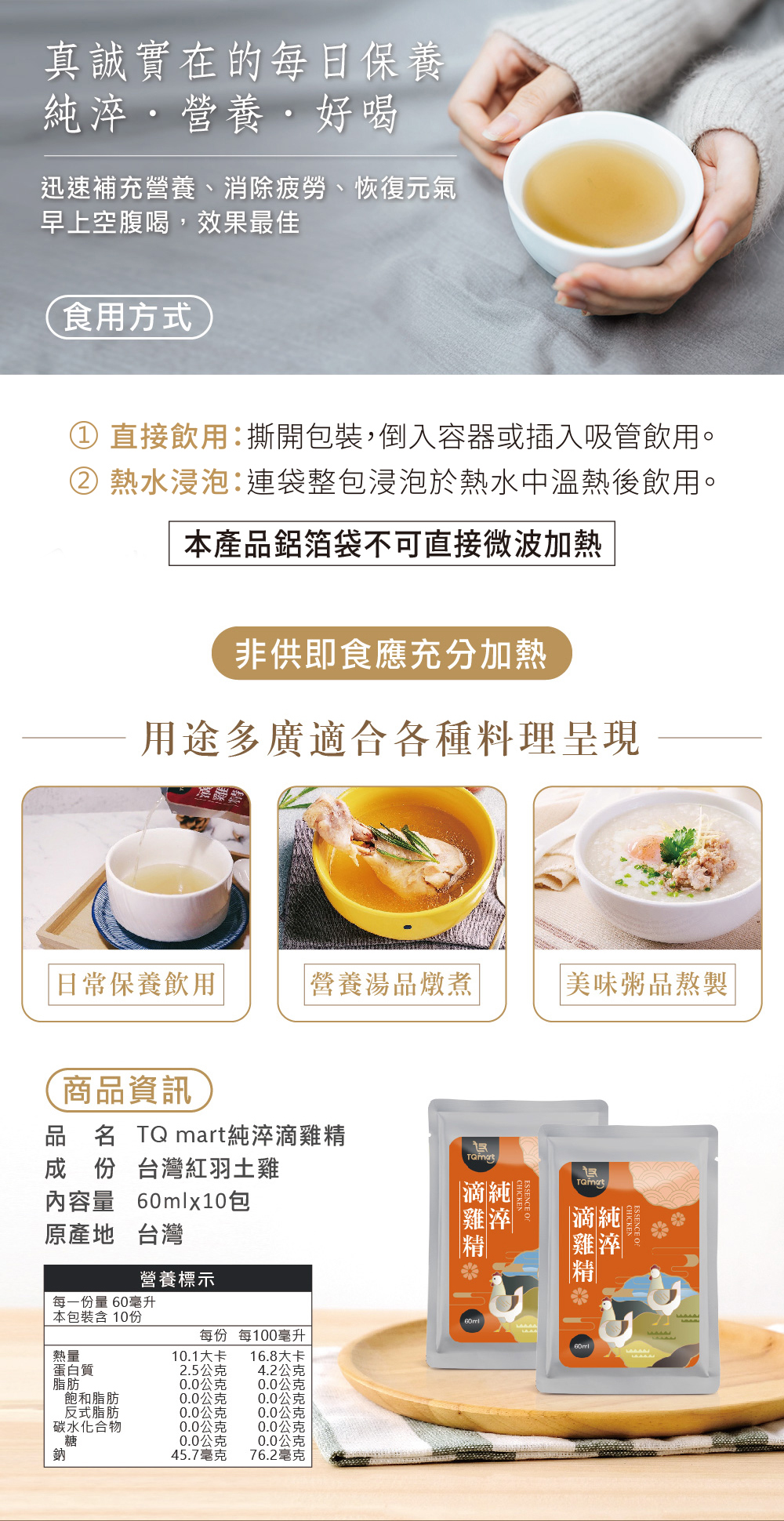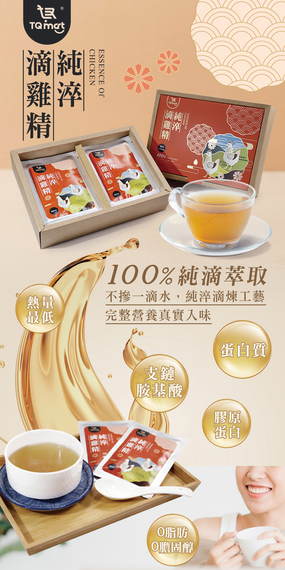 「TQ mart純淬滴雞精」嚴選優良台灣紅羽土雞,100%純滴萃取,無防腐劑、無人工色素、無人工調味、不摻一滴水,保存雞隻完整精華,包含豐富膠質、多種人體所需小分子胺基酸等,無添加、無腥味,每一口都是滿分濃郁精華,日常飲用可補充所需營養,傳遞健康與守護的心意。