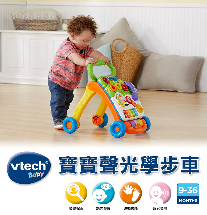 ●根據人體工學及寶寶發育身高比例而設計,推動學步車時會有好聽的旋律、音效和閃爍的燈光,鼓勵寶寶前進,進而發展寶寶的移動技巧、肢體統合和平衡能力。