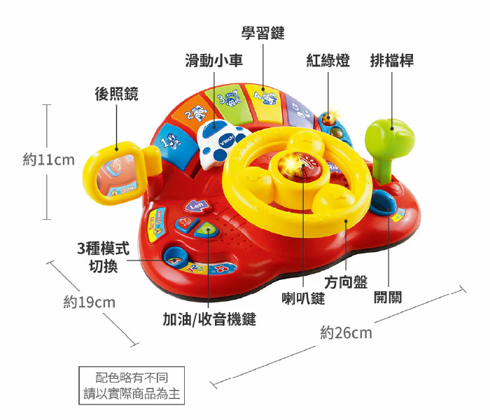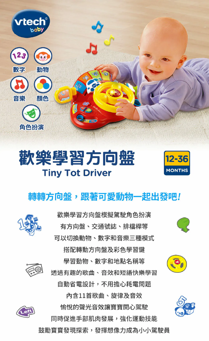 ☆玩具上有各種不同的按鍵和模擬駕駛盤的操作儀器,有交通號誌、排檔桿,還有動物、數字和音樂模式,配合有趣的音效和片語,讓寶寶沉醉在駕駛樂趣時,同時促進肌肉的發展以及增加學習的能力。