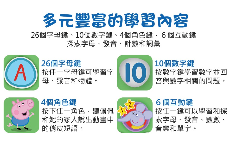 .內建許多佩佩的真實聲音及音效,讓學習變得更生動。