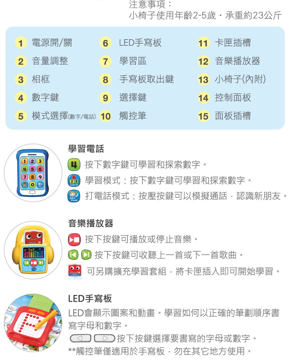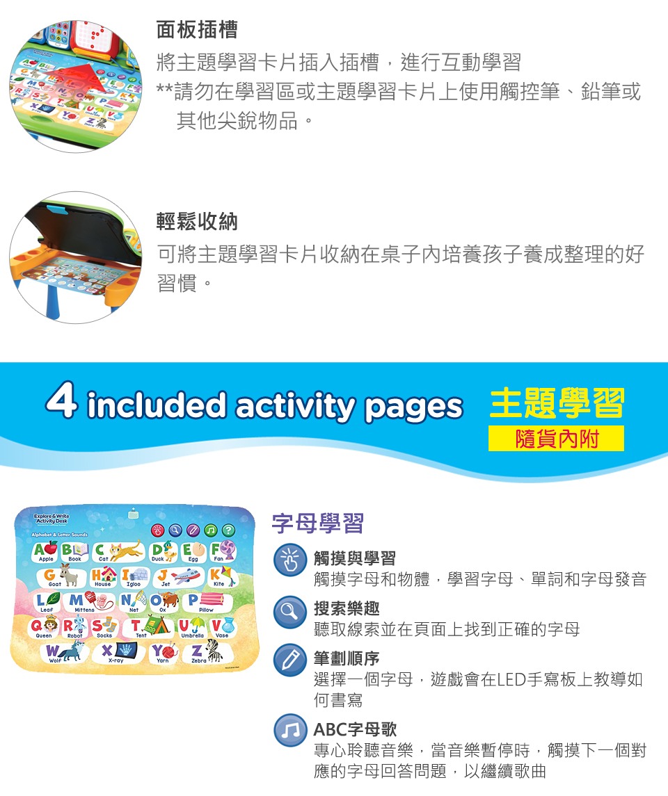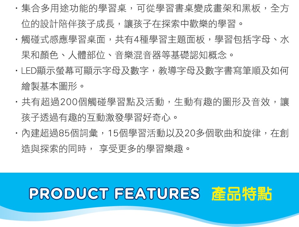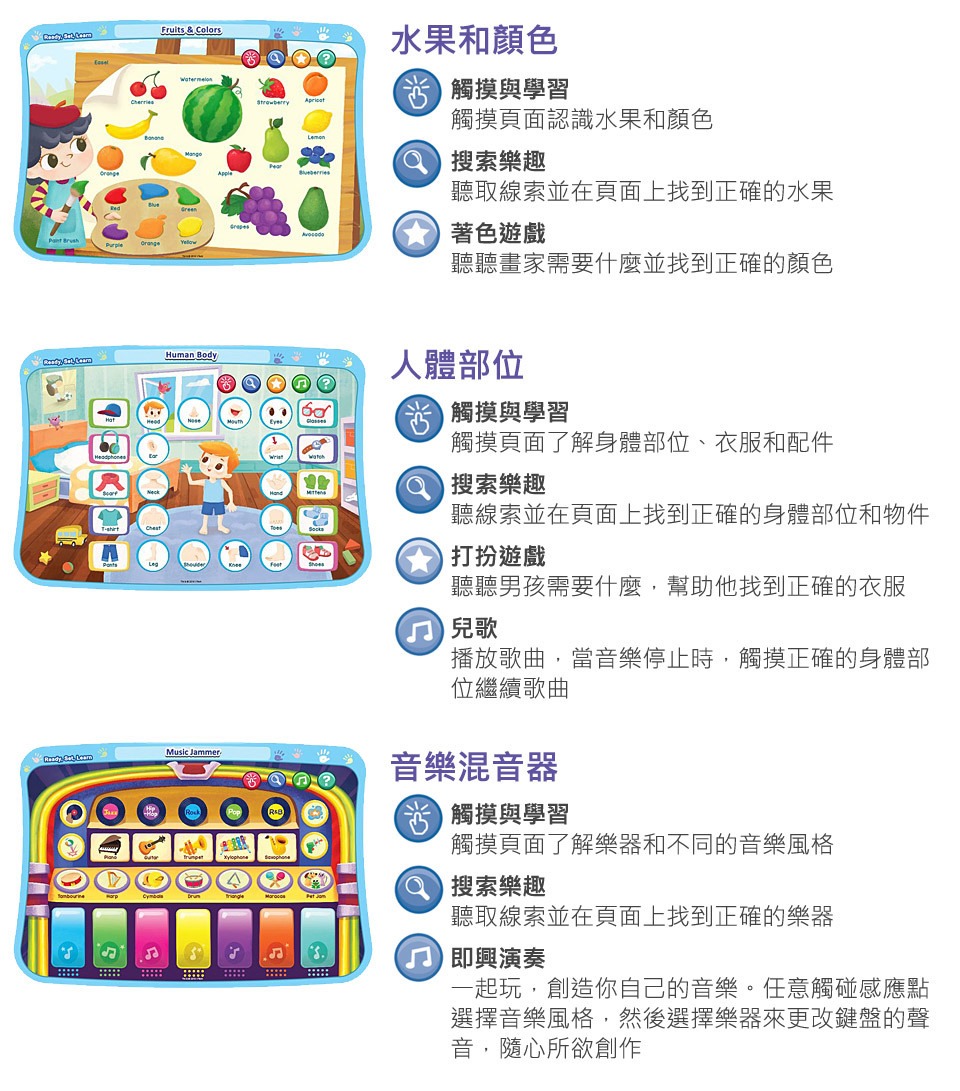 🔹共有超過200個觸碰學習點及活動,生動有趣的圖形及音效,讓孩子透過有趣的互動激發學習好奇心。