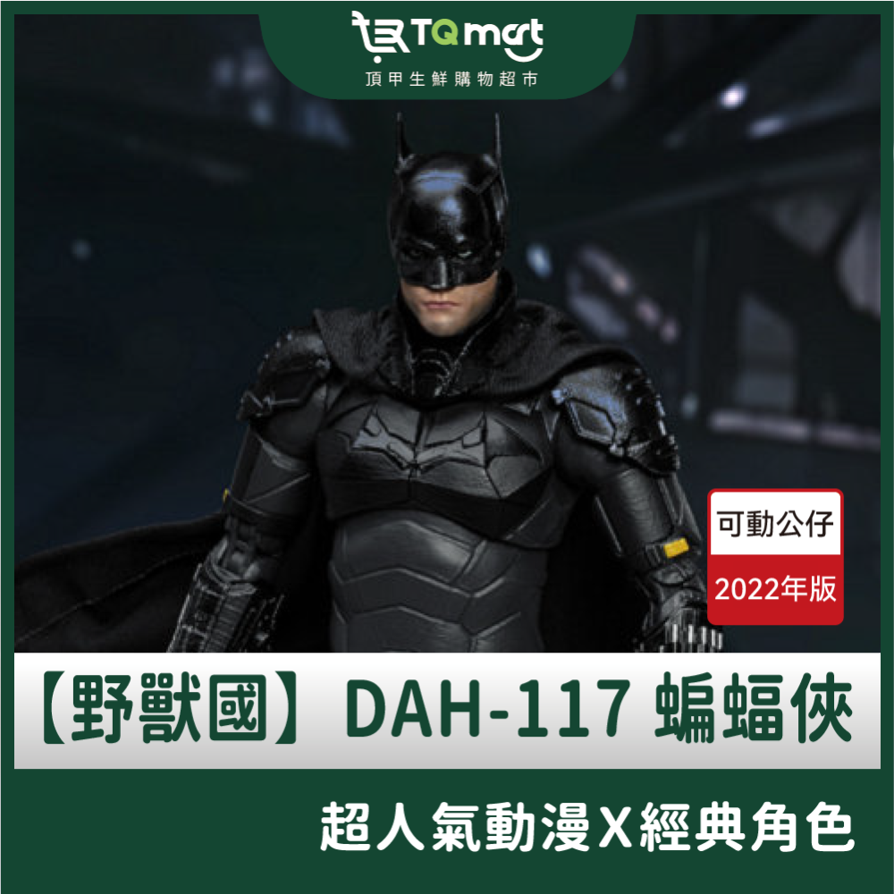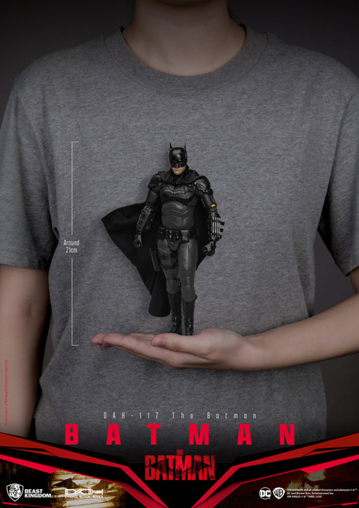 娛樂品牌「野獸國」以旗下高還原與可動設定廣受玩家喜愛的DAH (Dynamic 8ction Heroes) 系列推出全新力作「DAH-117蝙蝠俠 2022年版」。真實還原電影中蝙蝠俠,角色造型設定在布魯斯.偉恩接下高譚市復仇使者的身份的第二年,所親手打造的高科技盔甲戰衣,清晰可見蝙蝠面罩上的縫線,披風更是採用高質感布料製作,搭配上超過22處高度可動關節的設定,讓玩家們靈活擺放帥氣姿態,逼真還原電影中羅伯·派汀森所飾演的蝙蝠俠造型。