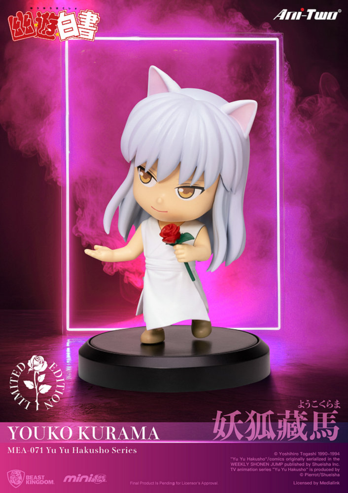 👑 妖狐藏馬(隱藏款):恢復妖狐真身的藏馬,擁有白狐耳朵與銀白長髮,身穿白衣,展現出魔界盜賊的霸氣氣場。他手持玫瑰,準備施展招牌攻擊「薔薇棘鞭刃」!