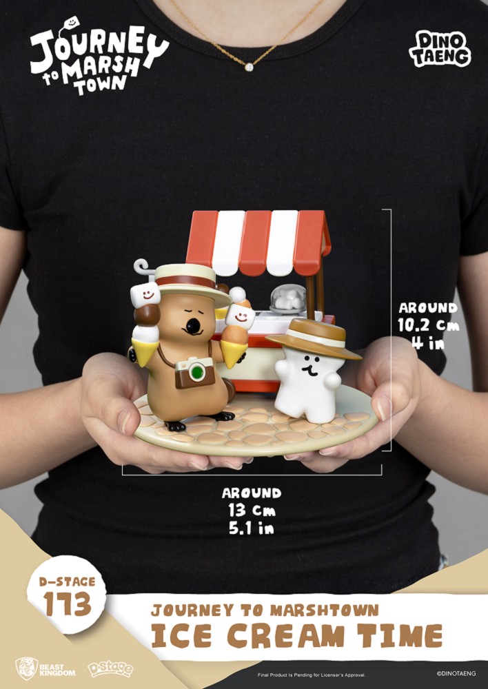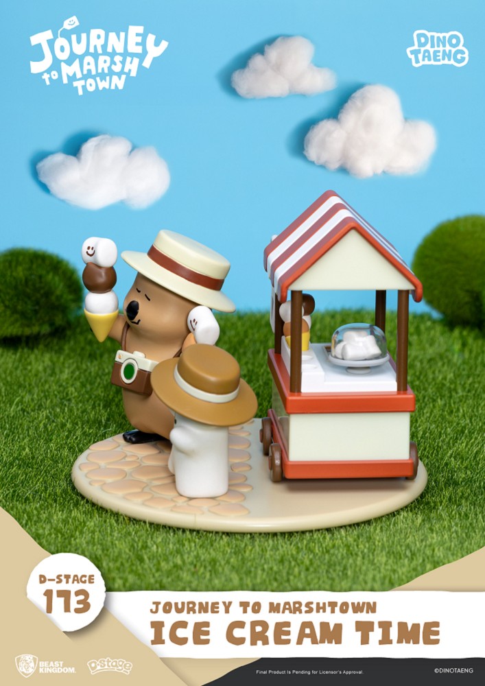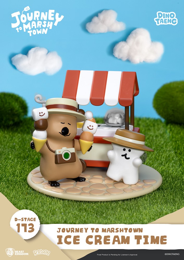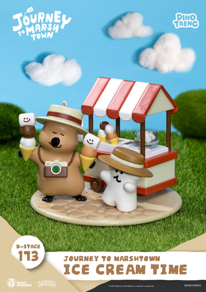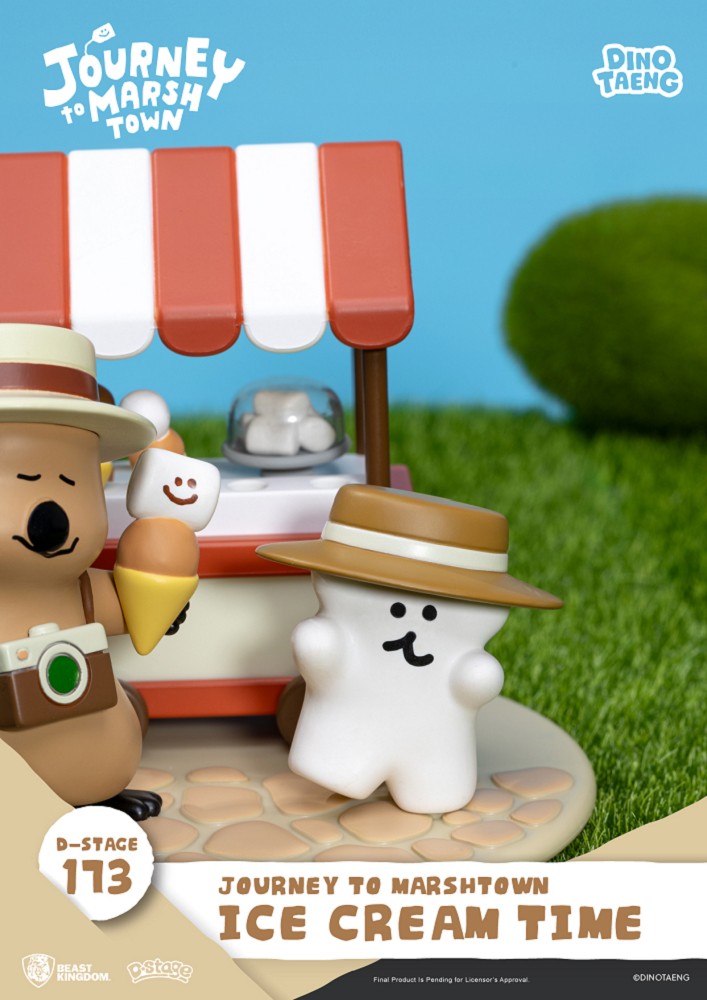 這回 Quokka 與BOBO 來到陽光燦爛的小鎮廣場,經營起最受歡迎的棉花糖冰淇淋小攤。紅白相間的遮陽棚配上陣陣甜香,瞬間營造出濃厚的夏日幸福感。兩人手裡捧著笑臉棉花糖做成的冰淇淋,頭戴寬邊草帽、胸前掛著相機,彷彿正沉浸在悠閒的陽光午後。從冰淇淋的層層堆疊、石板路的紋理,到小攤車上的甜品細節,都細膩呈現出棉花糖小鎮獨有的溫馨與趣味。