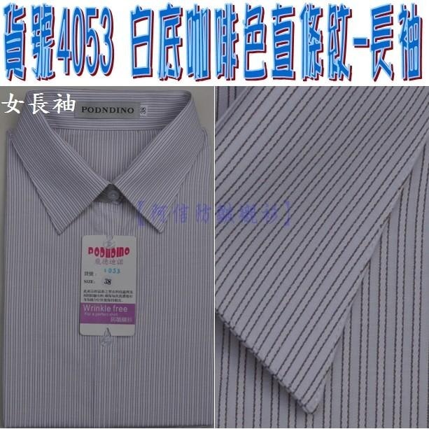 【阿信防皺襯衫】女長袖 貨號4053 白底咖啡色直條紋 ☆漂亮剪裁☆ 穿起來修身顯瘦,工廠直營平價供應