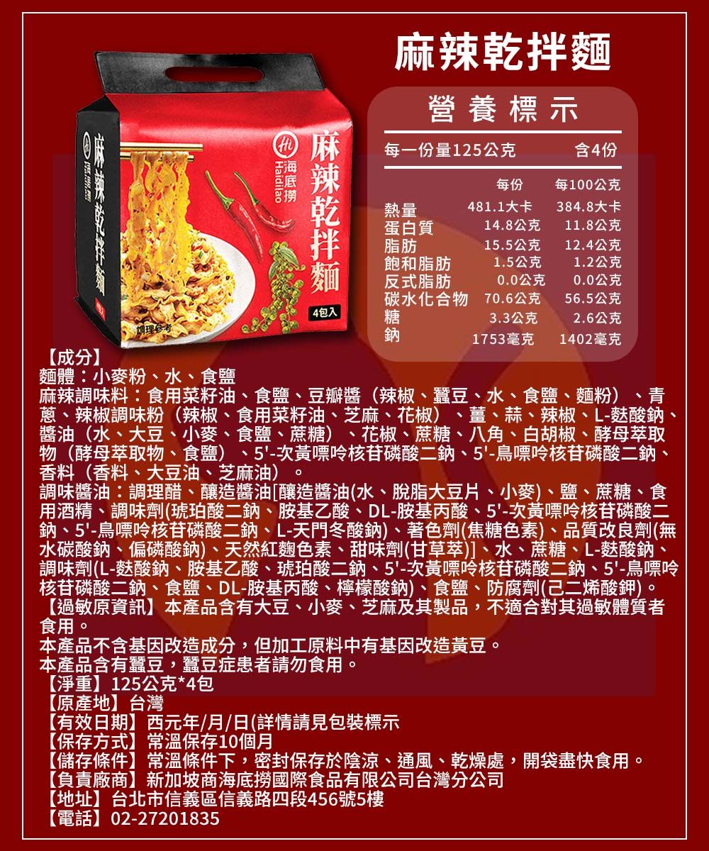 品名:海底撈麻辣乾拌麵