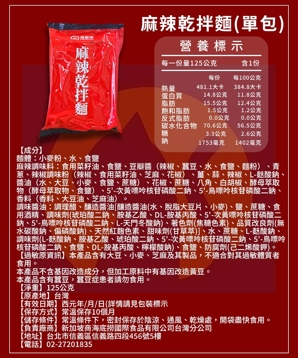 品名:海底撈麻辣乾拌麵