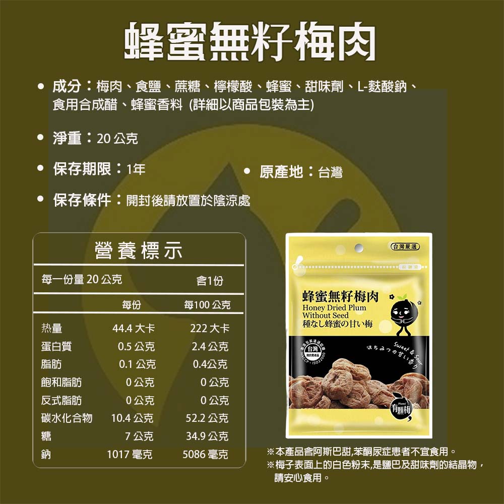 • 【單包】蜂蜜無籽梅肉20g 【單包】蜂蜜無籽梅肉20g