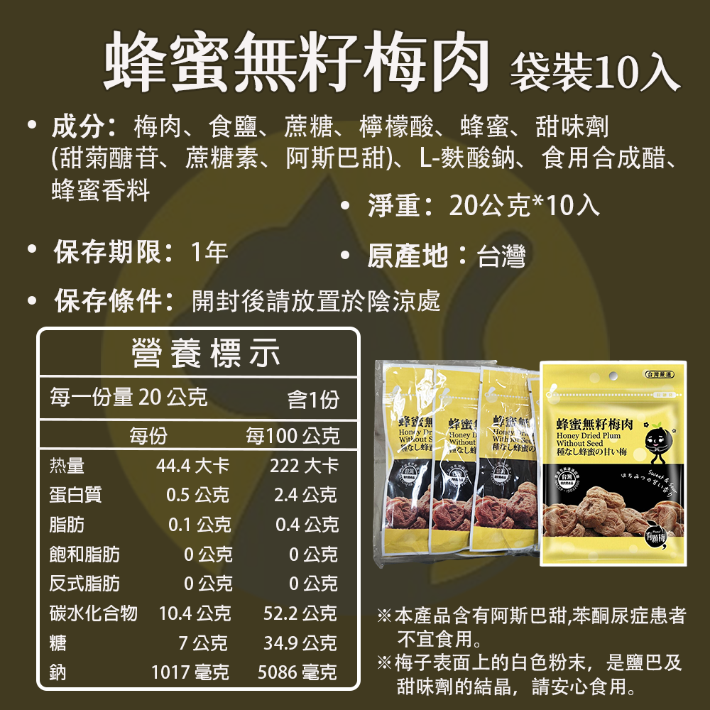 • 【整袋10入】蜂蜜無籽梅肉 20g 【整袋10入】蜂蜜無籽梅肉 20g