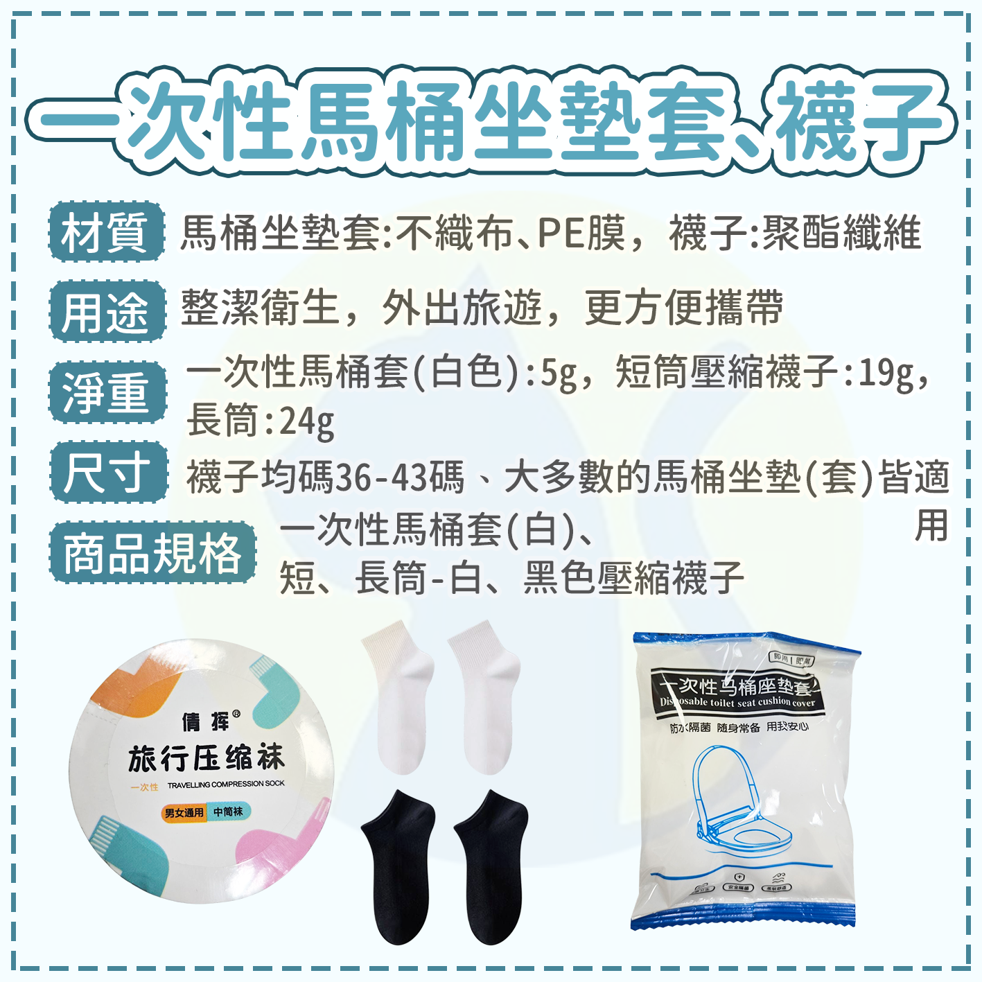 外出也能用得安心又乾淨。一次性浴巾、毛巾與襪子組合,獨立包裝,拆開即用,避免重複使用的衛生疑慮。材質柔軟親膚,吸水性佳,擦拭身體或雙腳都舒適不刺激。適合旅行、出差、露營、住飯店或運動後使用,用完即可丟,省去清洗與攜帶的麻煩,是隨身必備的衛生好物。