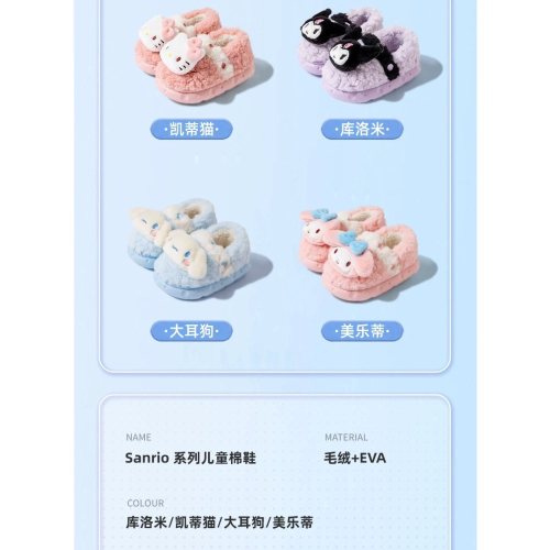 這款三麗鷗兒童保暖棉鞋以柔軟絨毛與輕量EVA鞋底製成,提供舒適腳感與良好保暖效果。鞋面採用立體角色造型設計,色彩柔和可愛,讓孩子在家中走動也充滿童趣與溫暖。防滑鞋底設計增加穩定性,適合秋冬居家穿著,是實用又討喜的兒童必備單品。