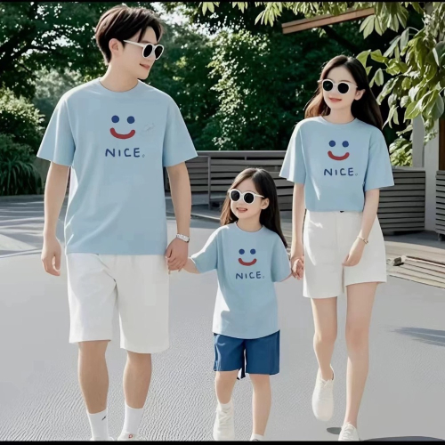 清新淺藍色系搭配簡約笑臉「NICE」字樣設計,展現自然又有活力的親子風格。舒適透氣的面料,讓大人與小孩在日常外出、旅行或假日散步時,都能自在穿搭、輕鬆展現好感親子穿搭感。