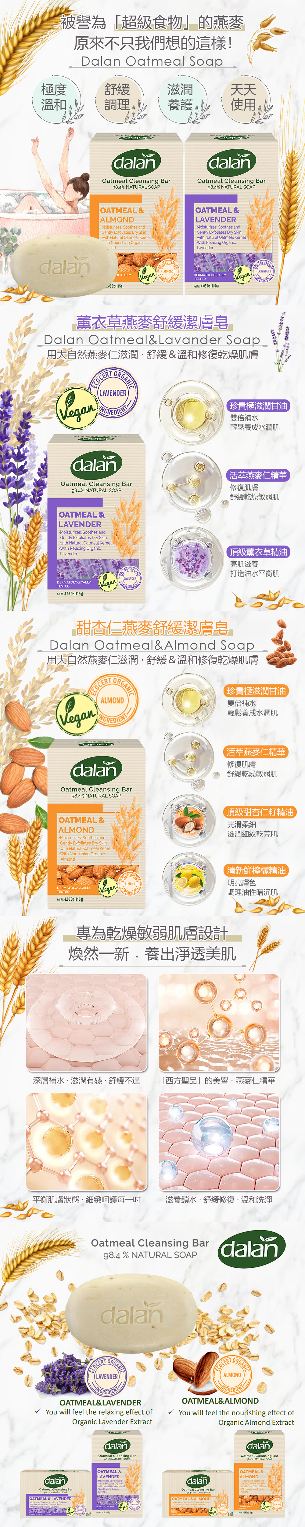商品內容:【土耳其dalan】燕麥舒緩潔膚皂115gX2入組➭多款-甜杏仁/薰衣草