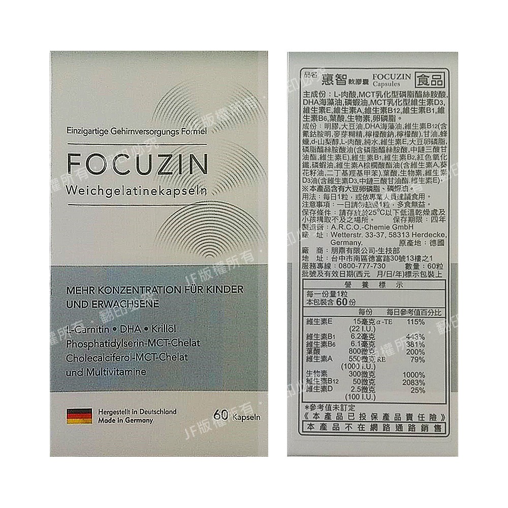 品 名 :Focuzin 惠智膠囊60粒。左旋肉鹼/MCT/DHA/Krill Oil/D3