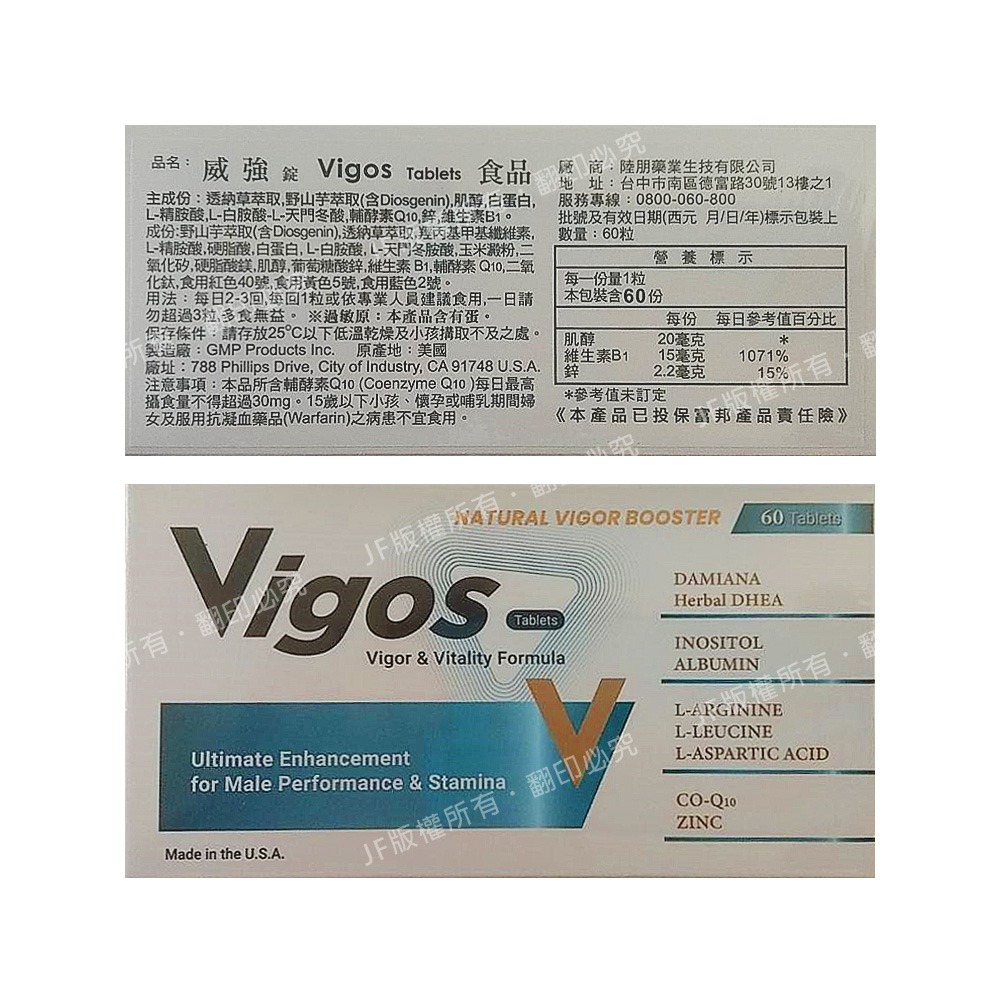 品 名 :Vigos 威強 60粒。透納草/野山芋/肌醇/白蛋白/L-精氨酸/L-白胺酸/鋅
