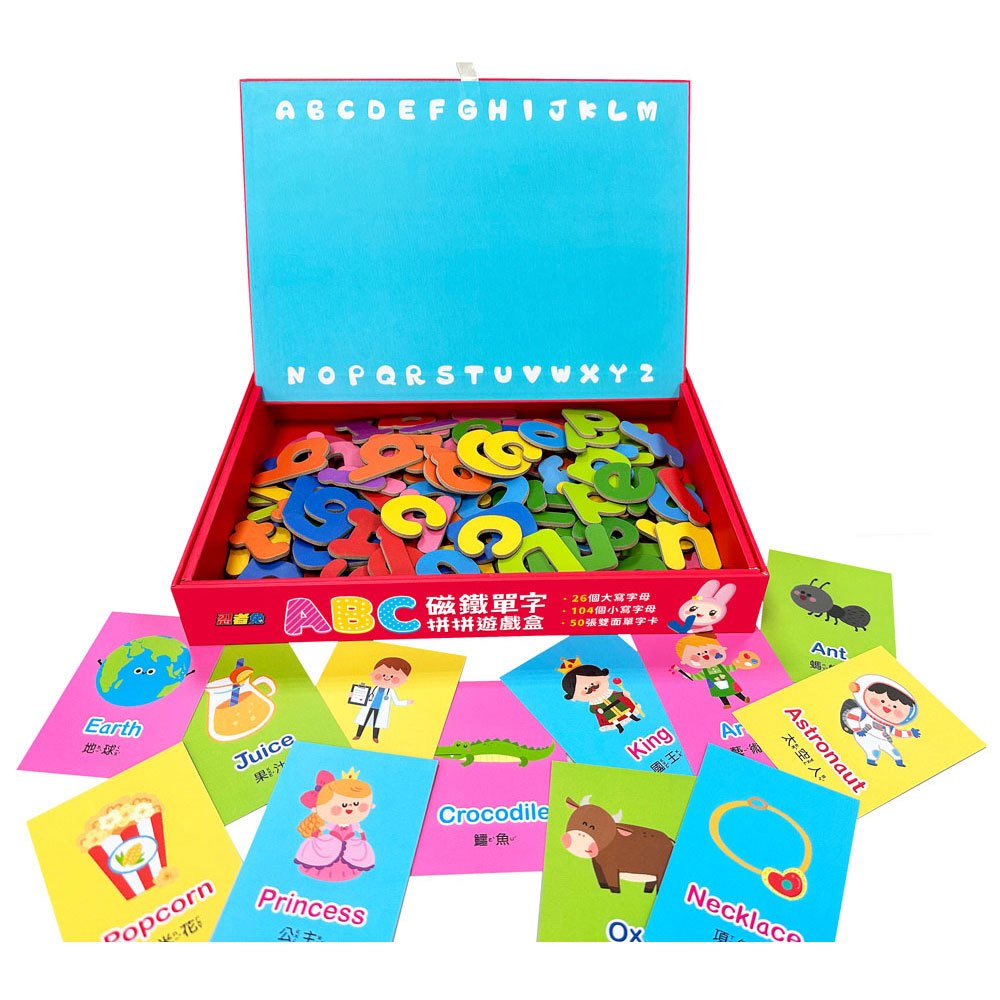 130個字母磁鐵、1個收納盒、50張雙面識字卡、1本親子手冊