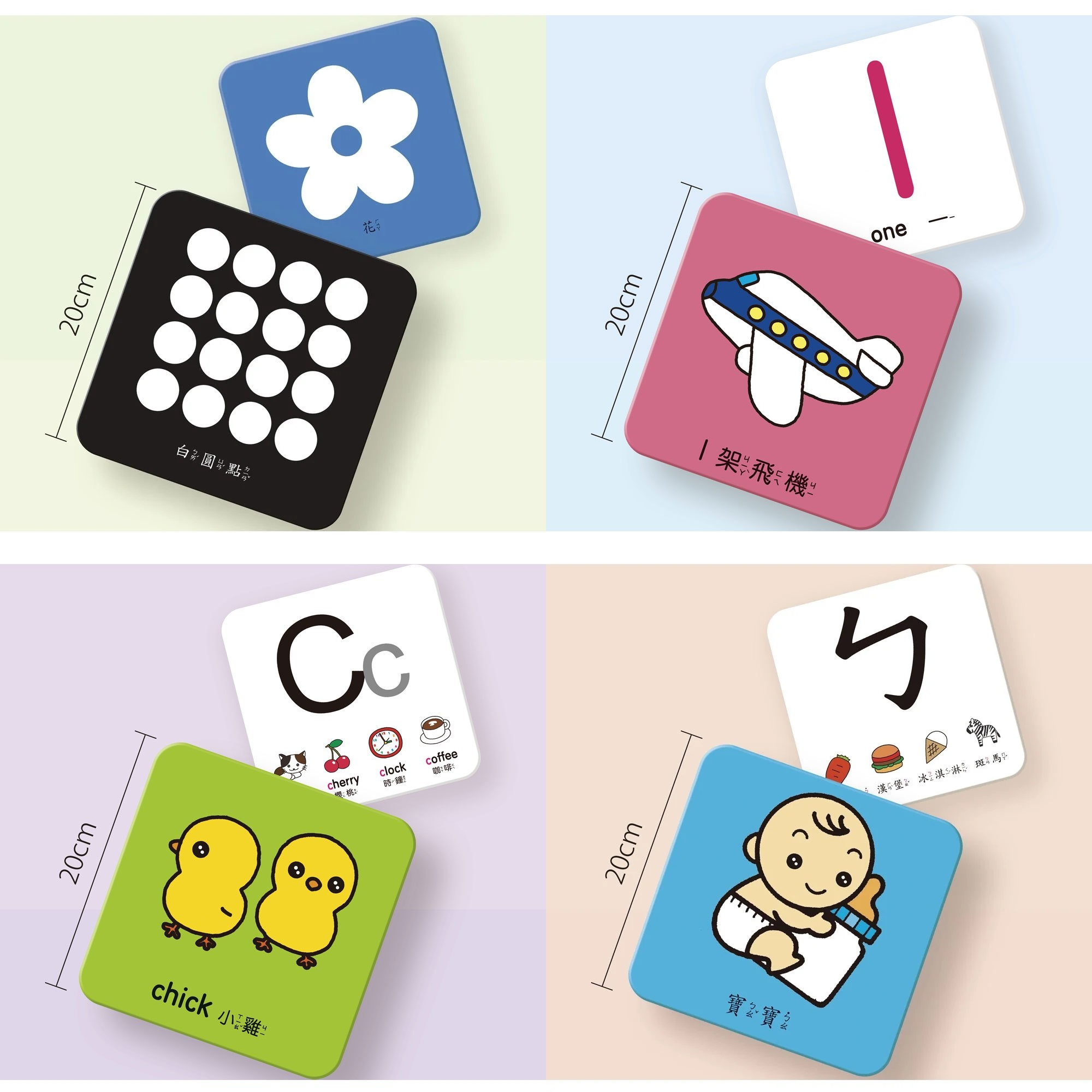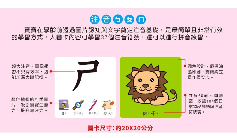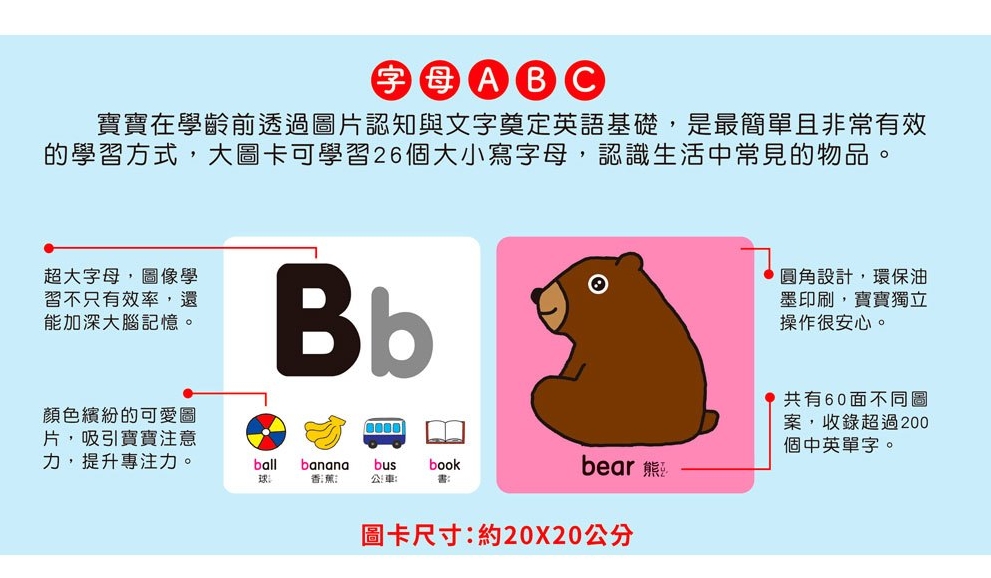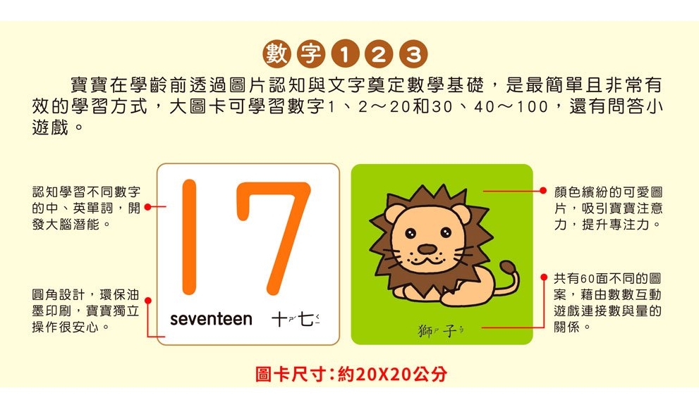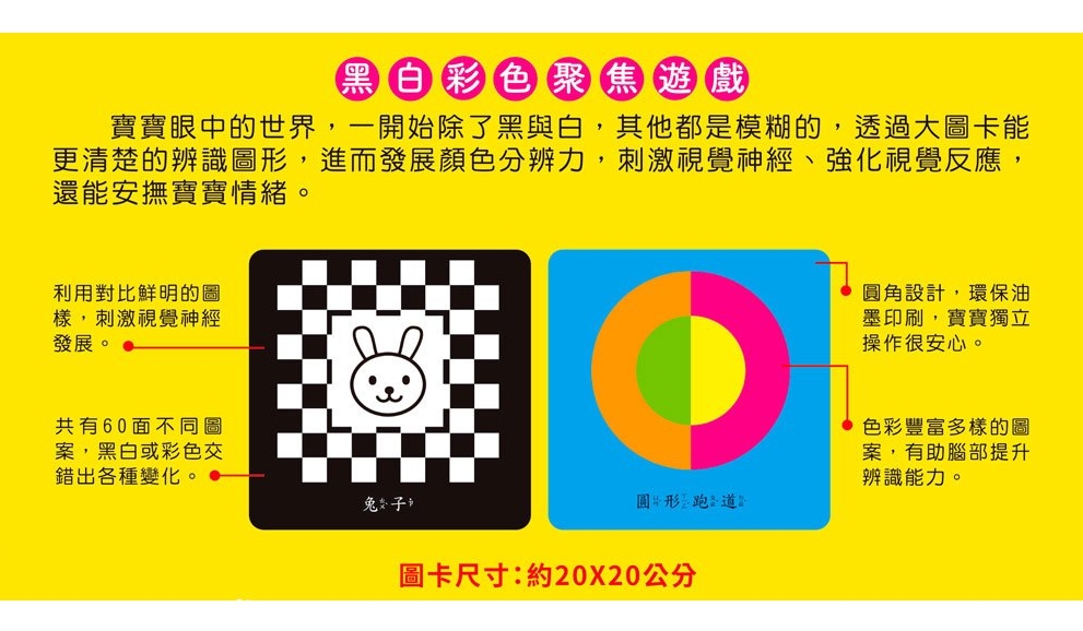 這款視覺認知大圖卡透過鮮明對比色與可愛插圖,吸引低幼孩童目光,幫助寶寶從遊戲中探索世界,並透過多感官學習,提升觀察力與認知能力。透過反覆練習,抓住黃金發展期,促進全腦開發,進而能夠更敏銳的感知世界!