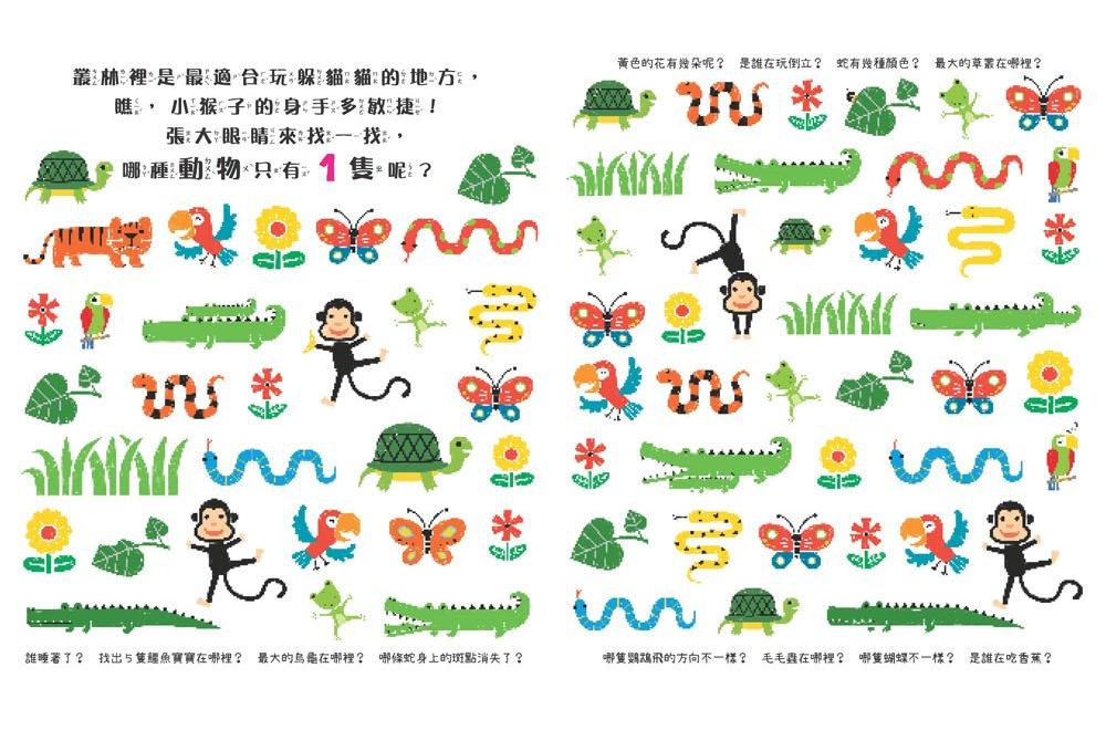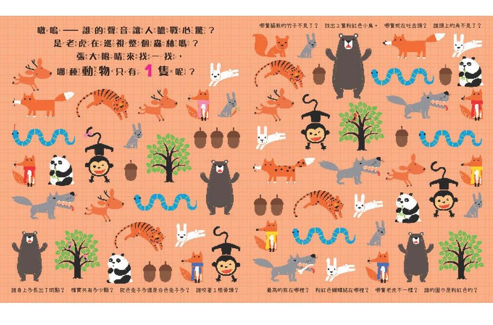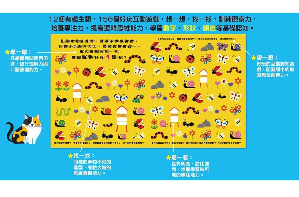 本書共有12個有趣主題,156個好玩互動遊戲,帶領孩子想一想、找一找,看看哪種動物或物品「跟其他不一樣」?不僅訓練觀察力、培養專注力,更能提高邏輯思維能力,學習數字、形狀、顏色等基礎認知。