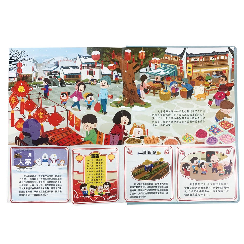 內容包含每個節氣的農耕活動、民俗節慶、時令飲食、傳說故事與詩詞諺語,淺顯易懂的文字敘述,簡單好玩,讓節氣更靠近孩子的世界。
