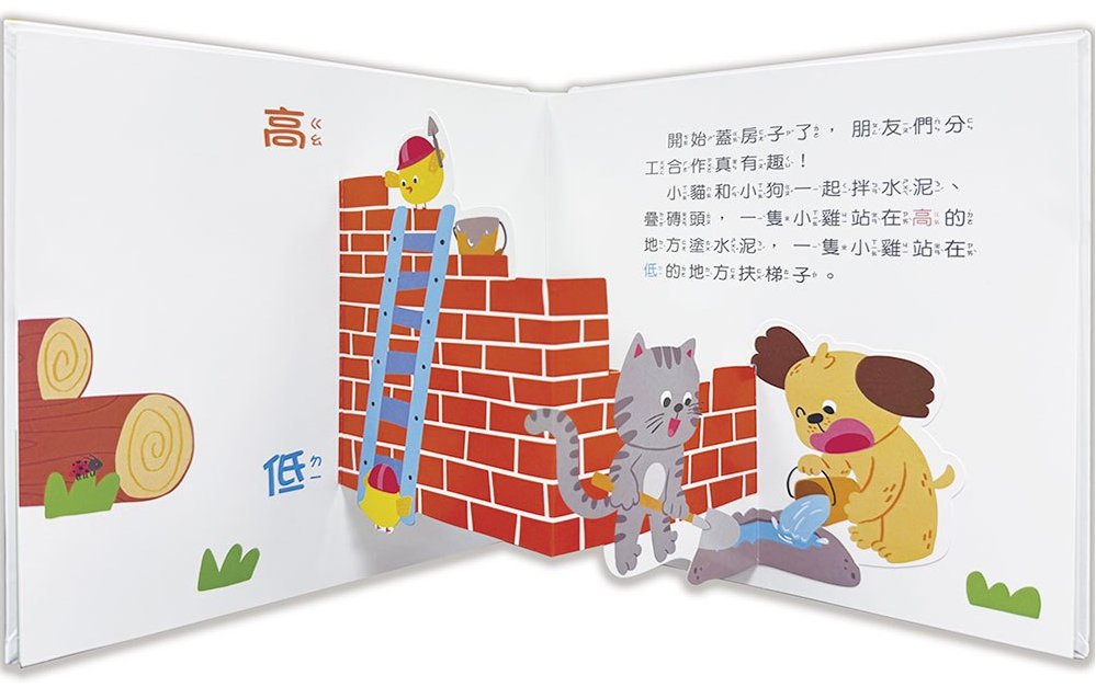 這是一本會「動」的遊戲書,透過有趣故事及立體互動效果,讓孩子認識多種對比詞與應用方式。每頁都有不同的彩色立體圖案,除了吸引孩子反覆閱讀,還能提升認知能力、訓練語文能力、建立對比概念、激發想像力,是非常適合親子互動的育樂書籍。