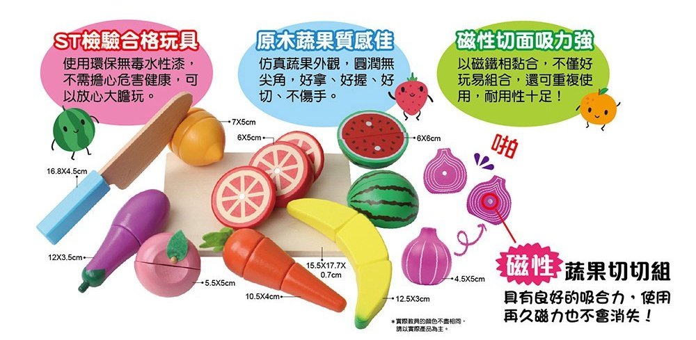 蔬果中間以磁鐵相黏合,不僅好玩易組合,還可重複使用,用再久磁性也不會消失,耐用性十足!
