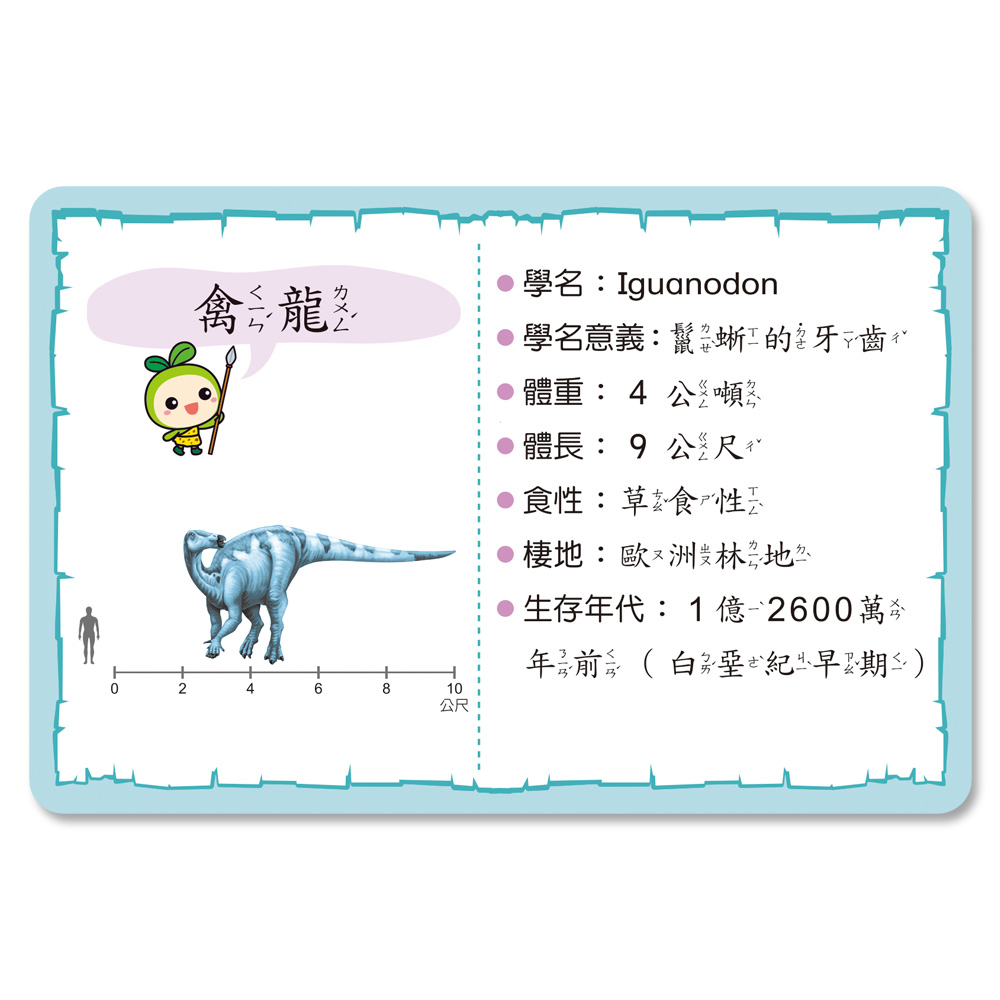 加大的字體,生動的彩圖,讓孩子藉由與家長的互動,或自己翻看圖卡認識來自世界各地的恐龍與爬蟲動物,是幼兒入學前的最佳輔助教具。
