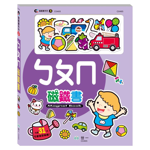 本系列磁鐵書依照主題,分成123、ABC、動物、交通工具、ㄅㄆㄇ、恐龍等,都是貼近幼兒生活經驗的內容,適合年齡層較小的幼兒使用。利用軟磁鐵可重複使用的特性,讓幼兒操作時可反覆學習,建立圖像認知概念,認識周遭事物名稱,滿足情境模擬的欲望,延伸數數、配對等小遊戲,並訓練手部抓握能力。造型可愛的軟磁鐵亦可與其他磁性產品操作結合,使用上更加靈活、有趣。