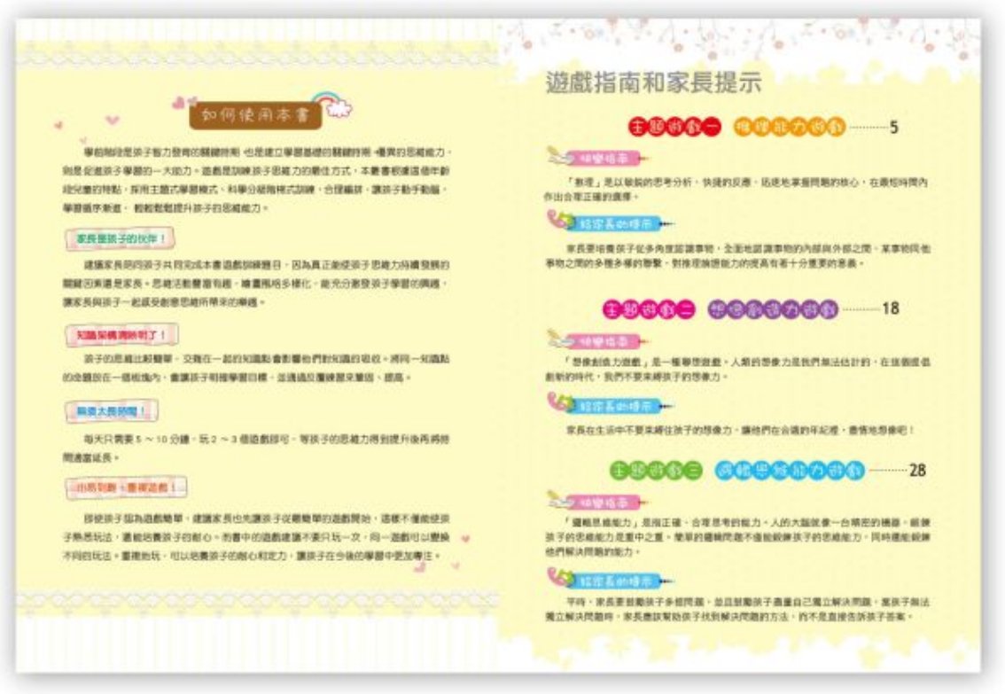 思維能力是學習能力的核心之一,人類一切偉大的發明創造都來自於強大的思維能力和創造能力。本套書採用主題式學習模式、科學分級階梯式訓練、通過反覆練習,由易到難的遊戲題目,來提升孩子的思維能力,從而提高孩子的學習效率和創造能力。