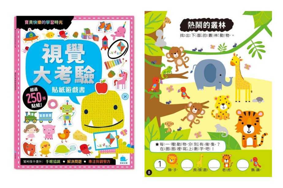 全套包含視覺挑戰、走迷宮、找不同、加法、顏色圖形、觀察配對6種主題,考驗眼力、專注力及手眼協調,全方位開發幼兒的大腦潛能。每頁的主題童趣多變,如公主、恐龍、叢林動物甚至是外太空等,絕對能吸引孩子的注意力,提升學習的興趣。精緻可愛的插畫風格,培養孩子的美學品味,不只玩出智力,也在潛移默化中提升審美力。