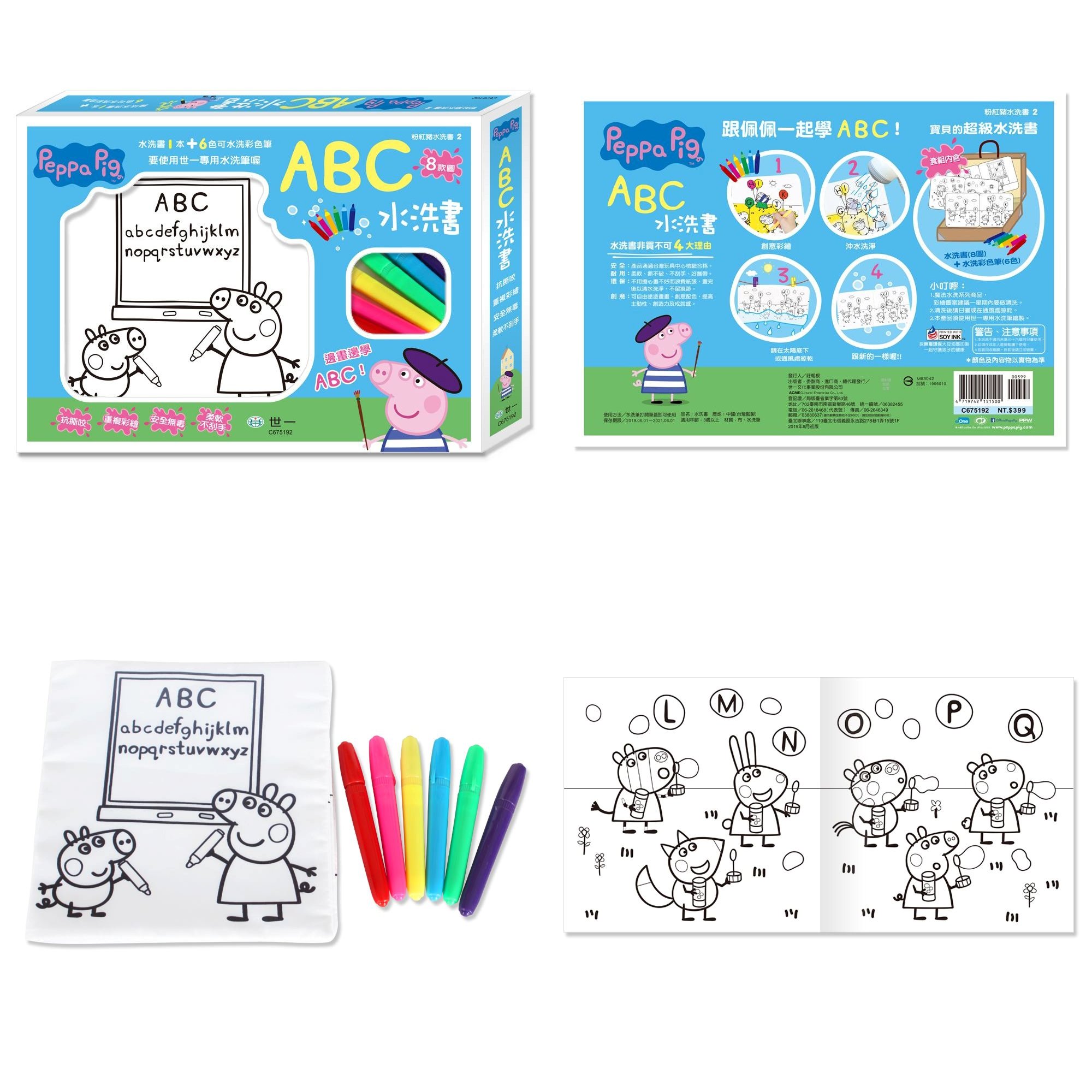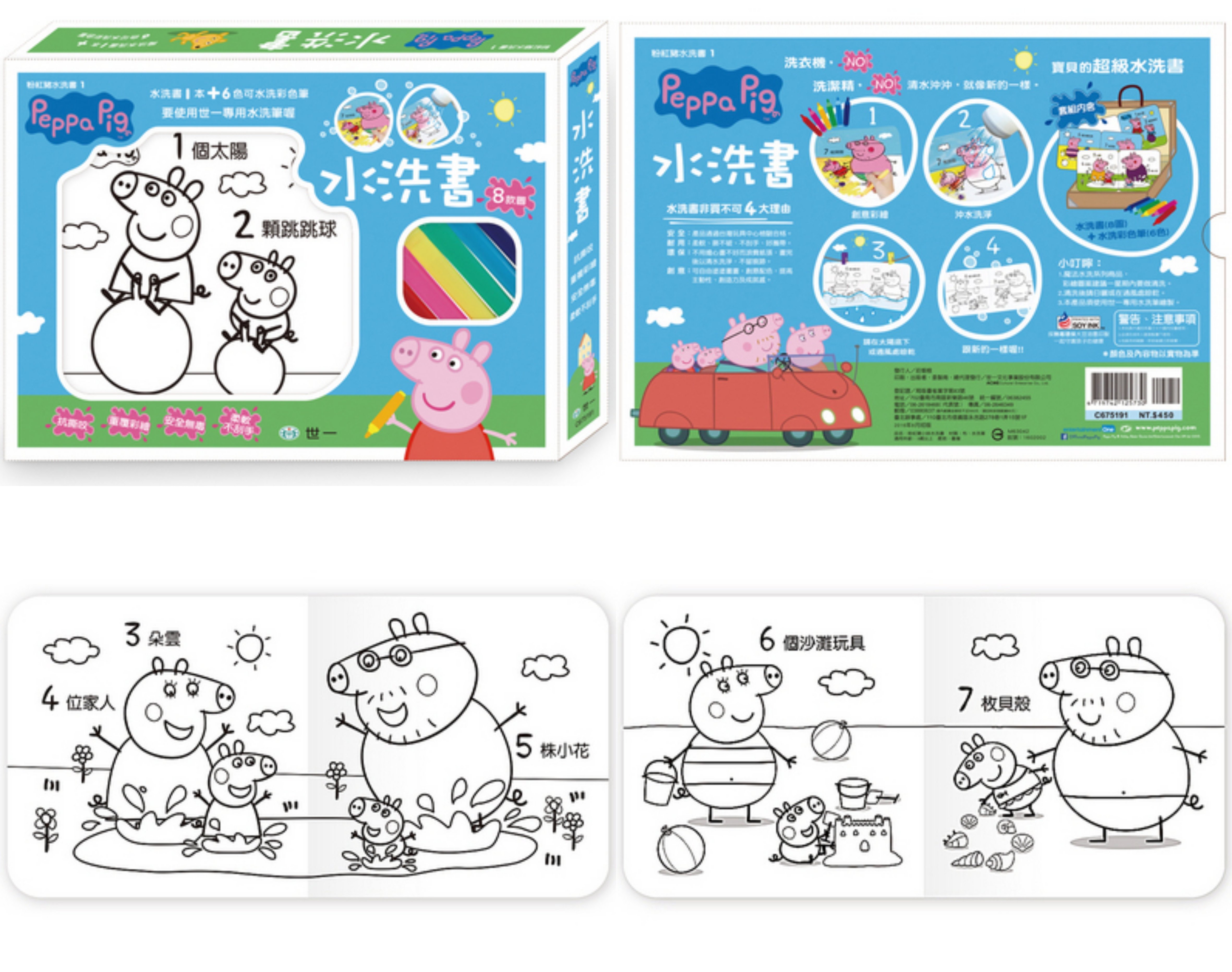 本產品組合內含8圖可愛水洗書1本、6色水洗彩色筆