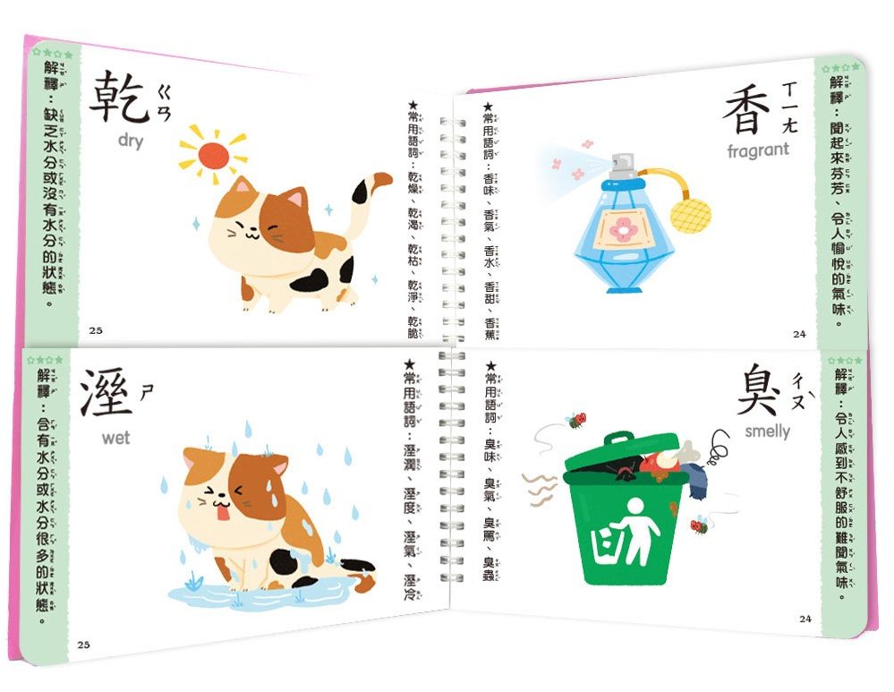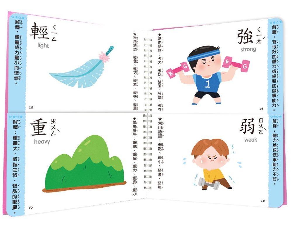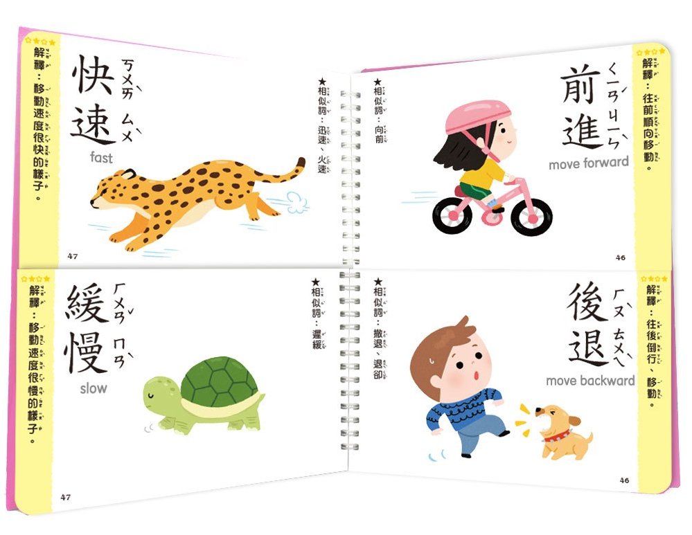 本書以翻翻配對方式,讓孩子利用圖片聯想來認識相反詞,並了解每個語詞的意思、用法或相近詞,逐漸學會100組相反詞,之後在說話、造句和寫作時,便懂得運用不同的詞彙來增添句子的豐富度,表達也會更加生動,語文能力會變得越來越棒!
