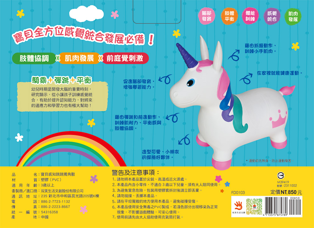 1.跳跳馬採用純正新料加工,非二手回收料,不加有害的去味劑或香料,符合國際標準,通過玩具商品檢驗。