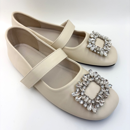 杏色鞋面搭配精緻水鑽方扣,低調卻很有存在感,