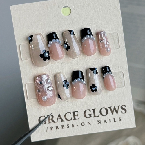 No.009丨花黑噴【珍珠丨法式丨貓眼丨黑色系】手工穿戴甲