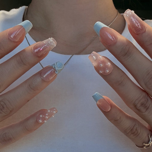 No.020【碎鑽丨珍珠丨蝴蝶結丨立體造型丨法式丨漸層丨藍色系】手工穿戴甲