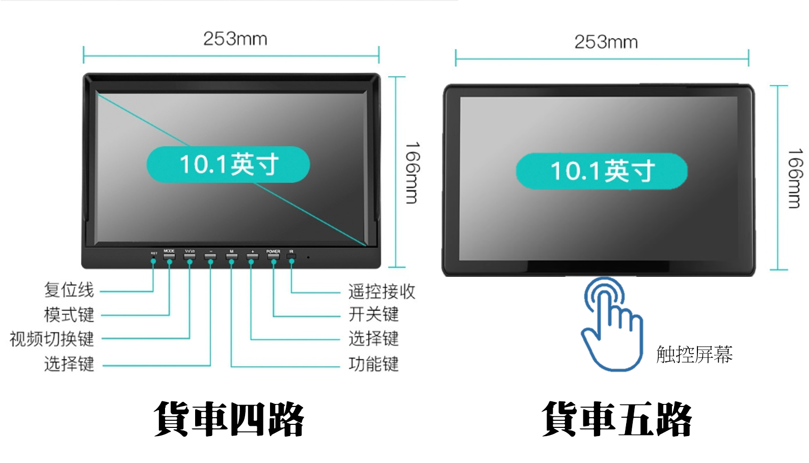 💮五錄產品內容物:10.1吋觸控顯示屏、中控台支架、5米航空線*4、15米後視航空線*1、高清攝像頭*5。