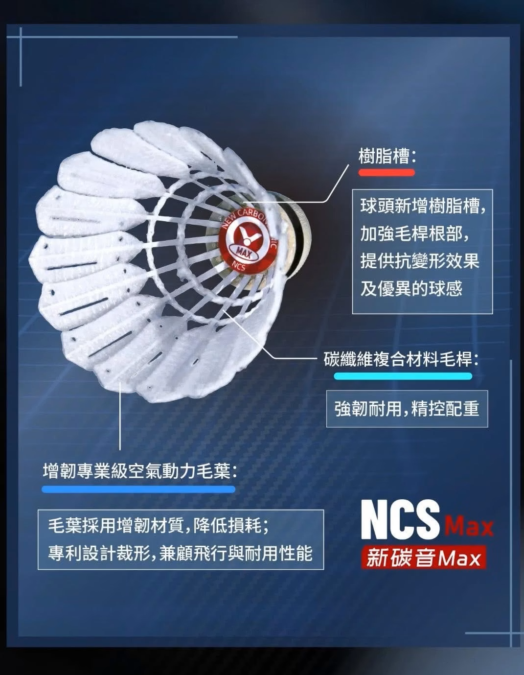 特色:新碳音再升級NCS MAX,兩大強化科技,重新定義打感體驗。✅ 專利黑科技-樹脂槽:球頭新增樹脂槽設計,加強毛桿根部結構,扎實抗變形,耐用與穩定同步進化。 ✅ 新版本-增韌專業級空氣動力毛葉:增韌材質提升毛葉耐用性,精密配比提升飛行與滾動表現,打感更逼近天然羽球。