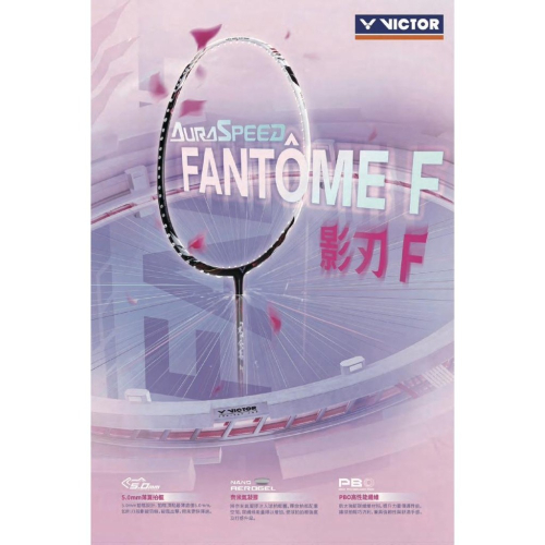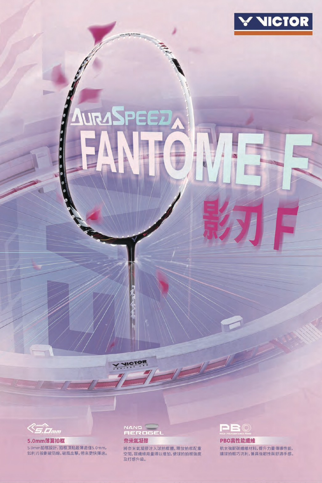 特色:專為追求速度感的女性球友打造,影刃F搭載6.6mm中管設計,提供柔韌輕彈的打感,並承襲影刃系列三大尖端科技,讓每次出拍都更迅疾俐落。拍框採用奈米氣凝膠打造VICTOR最薄5.0mm拍框設計,如利刃般破風出拍,提供女性球友極致速度體驗。