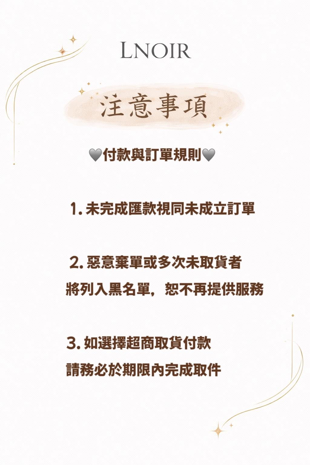 <ul><li><span><b>惡意</b></span><span style="font-family:'-apple-system', BlinkMacSystemFont, 'Segoe UI', Roboto, 'Helvetica Neue', Arial, 'Noto Sans', sans-serif, 'Apple Color Emoji', 'Segoe UI Emoji', 'Segoe UI Symbol', 'Noto Color Emoji'&#59;">棄單或多次不取貨者將入黑名單</span></li><li><font face="-apple-system, BlinkMacSystemFont, Segoe UI, Roboto, Helvetica Neue, Arial, Noto Sans, sans-serif, Apple Color Emoji, Segoe UI Emoji, Segoe UI Symbol, Noto Color Emoji"><span>開箱請全程錄影,保障雙方權益</span></font></li><li><font face="-apple-system, BlinkMacSystemFont, Segoe UI, Roboto, Helvetica Neue, Arial, Noto Sans, sans-serif, Apple Color Emoji, Segoe UI Emoji, Segoe UI Symbol, Noto Color Emoji"><span>如有問題請於收到貨後24小時反映</span></font></li></ul>