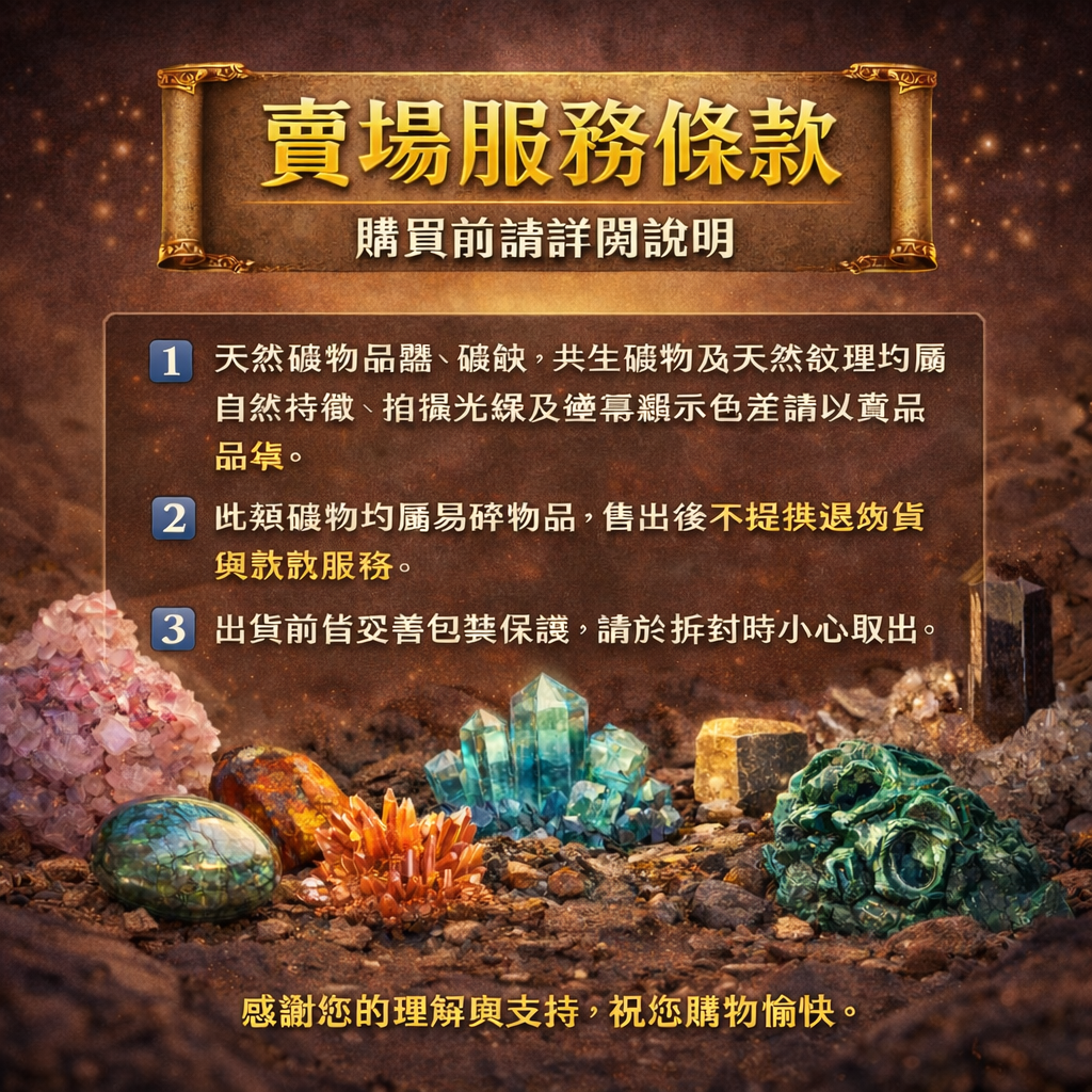 <p>選購收藏礦石,下單前請詳閱以下說明:</p><p>🔹 本賣場商品皆為天然礦物原礦,晶體內含物、礦缺、共生礦物與天然紋理均屬自然形成特徵,並非瑕疵。</p><p>🔹 商品皆為實物拍攝,因拍攝光線及螢幕顯示不同,顏色可能略有差異,請以實品為準。</p><p>🔹 礦石屬天然脆性礦物,出貨前皆妥善包裝保護,拆封時請小心取出。</p><p>🔹 商品售出後 不提供退換貨與退款服務,請確認喜歡與可接受後再行下單。</p><p>🔹 商品可能同步於其他平台販售,如遇同時售出,將依付款完成順序出貨。</p><p>感謝您的理解與支持,祝您收藏愉快。</p>