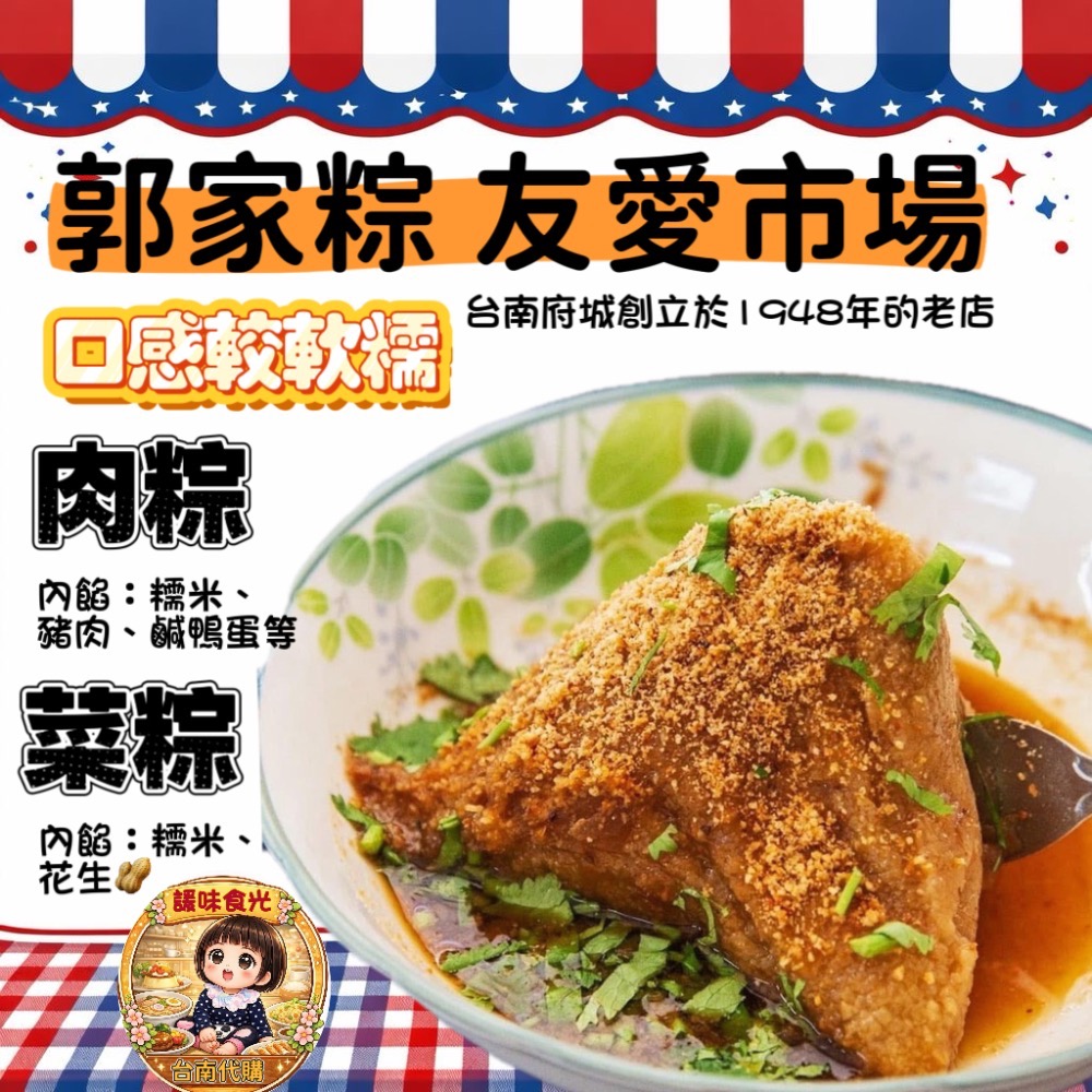 台南傳承三代70多年粽子老店,友愛市場台南「郭家粽」使用炒肉的肉汁成了店家的招牌醬料,肉粽淋滷肉汁最傳統的古早味!一顆菜粽加一顆肉粽再配一碗豆噌湯完美組合啊!