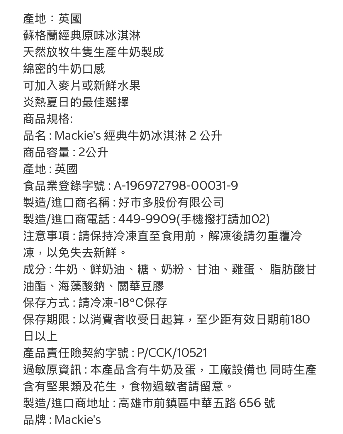 好市多代購/Mackie's 經典牛奶冰淇淋2公升