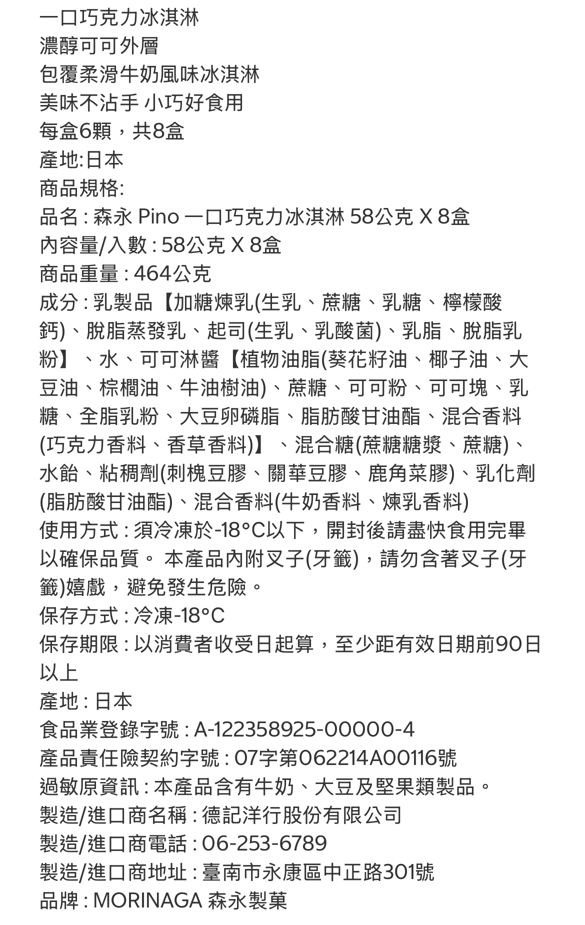 好市多代購/森永 Pino 一口巧克力冰淇淋58公克 X 8盒#251538