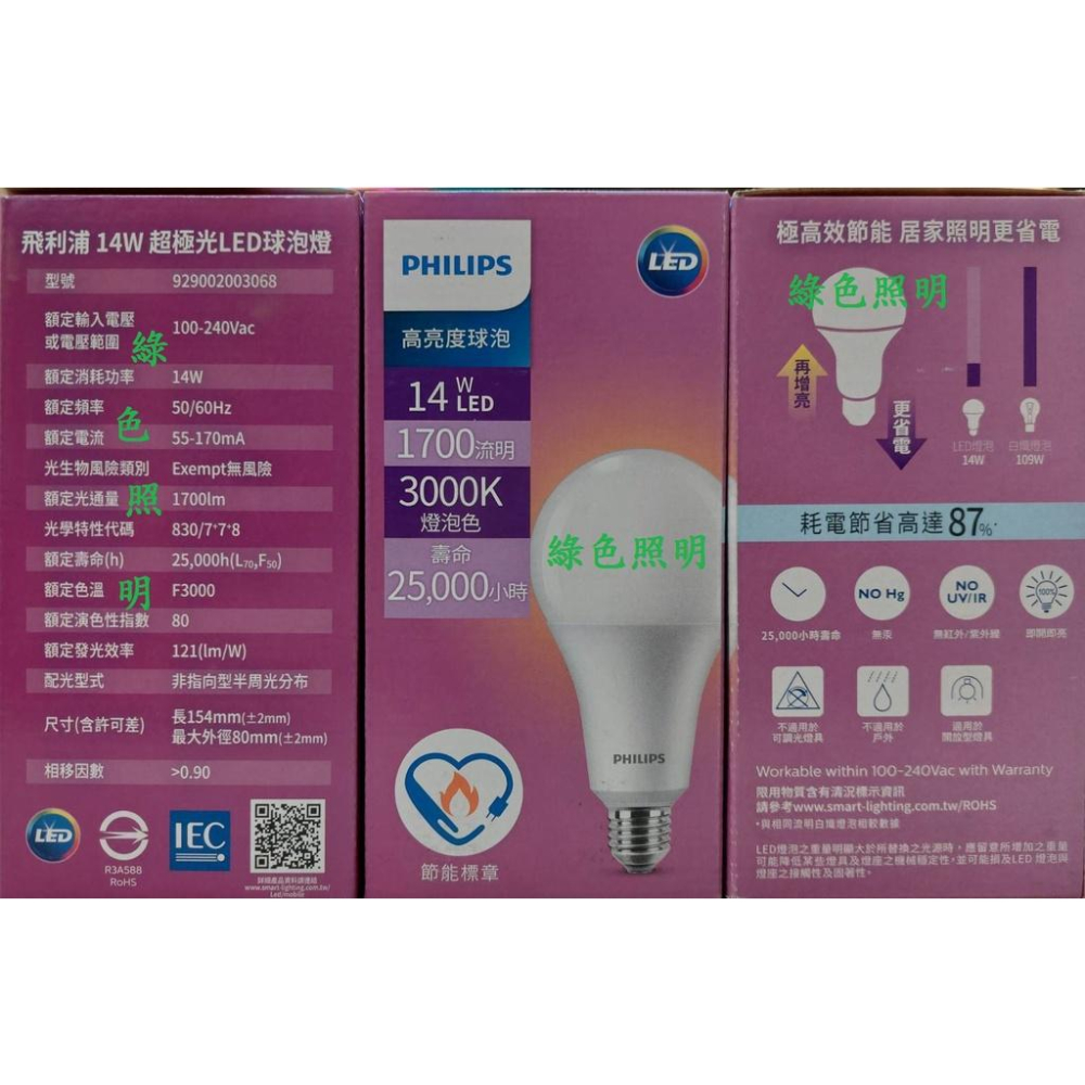 綠色照明 ☆ PHILIPS ☆ LED 高亮度燈泡 14W 超極光 燈管 燈泡 球泡燈 省電燈泡 只剩黃光
