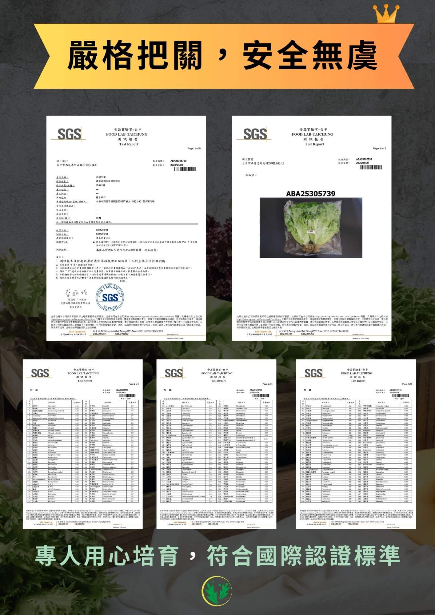 在優質環境控管下培育出,無農藥、低硝酸鹽、無重金屬汙染疑慮的生菜、符合生食等級