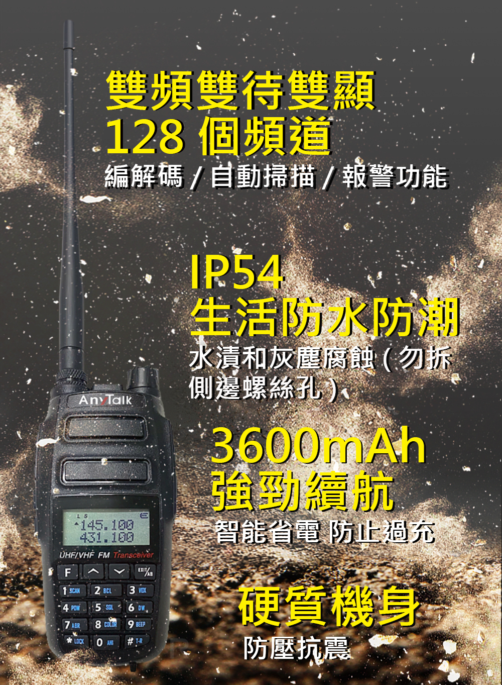 頻率範圍 VHF144–146MHz / FM 87.5-108/76-108/76-90/64-76 / UHF430–432MHz