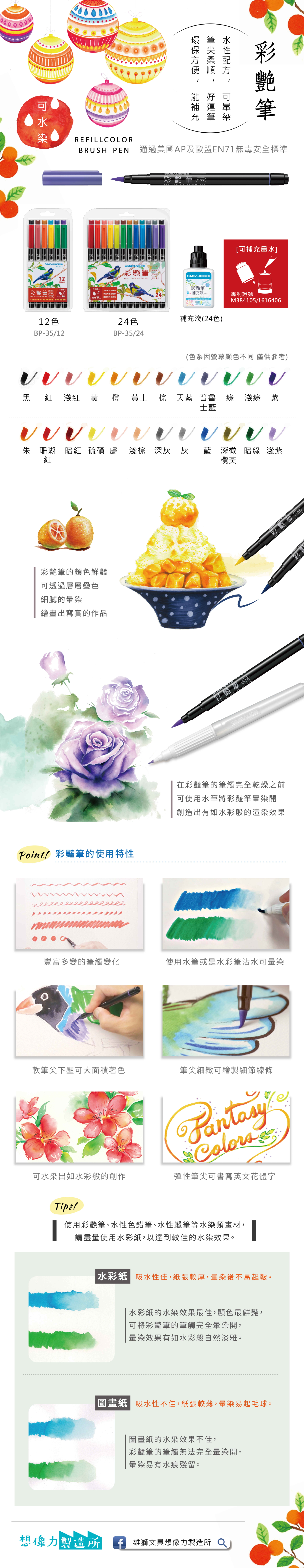 色彩鮮艷飽和,水性配方並藉由重疊技法,可使暈染達到自然生動效果!採仿毛筆式筆尖設計,線描特性表現幅度寬廣,可輕巧描繪出細緻圖像!除繪畫外亦可書寫文字。與其它彩色筆類產品相較下,屬於多功能筆類。