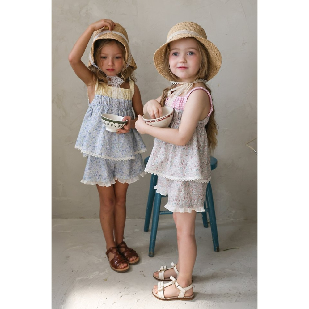 上身格紋搭配下擺細緻碎花